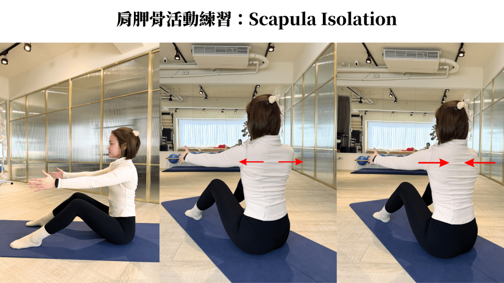 恢復肩胛骨各方向活動度,練習找到中立位置,讓周圍肌肉可以在良好長度下發力。重新建立肩胛骨和手臂動作的協同關係,增加肩關節活動空間的同時也避免使用錯誤肌群發力。練習在動作過程中將肩胛骨穩定的貼合在胸廓上,且輕微的往脊椎中間收攏,抵銷圓肩向前的拉力。