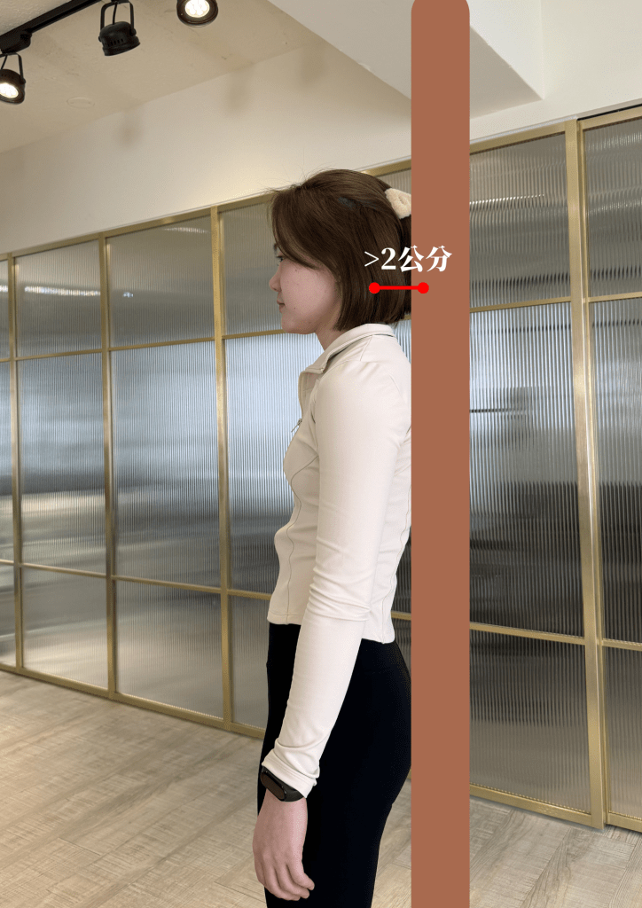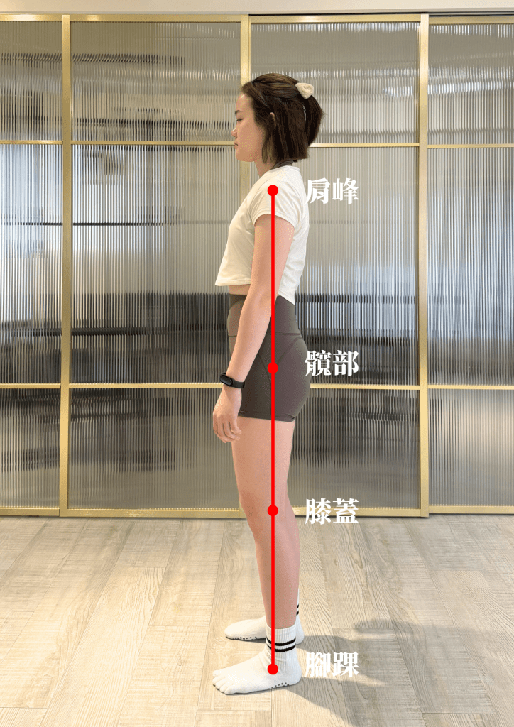 (方法二)從側面來看,腳踝、膝蓋、髖、肩峰應該要在同一條鉛垂線上,如果肩峰明顯在前,代表可能有圓肩。