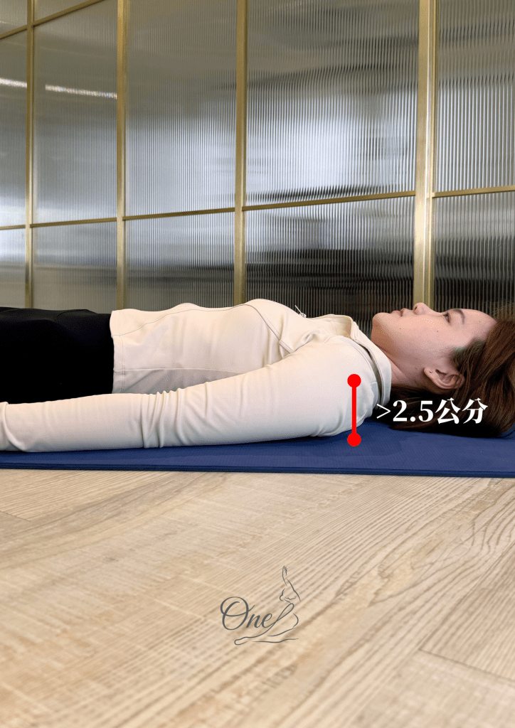 (方法一)平躺在瑜珈墊上,找到肩膀外側最凸點肩峰,測量肩峰和瑜伽墊的距離,如果大於2.5公分就可能有圓肩!